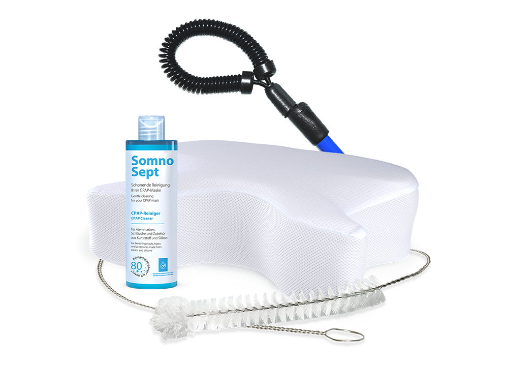 Das Set besteht aus einem CPAP-Kissen, einem Schlauchhalter, einem CPAP-Reiniger und einer Schlauchbürste. Das Kissen verhindert Druckstellen, der Schlauchhalter sorgt für Bewegungsfreiheit, Reiniger und Bürste garantieren hygienische Sauberkeit.