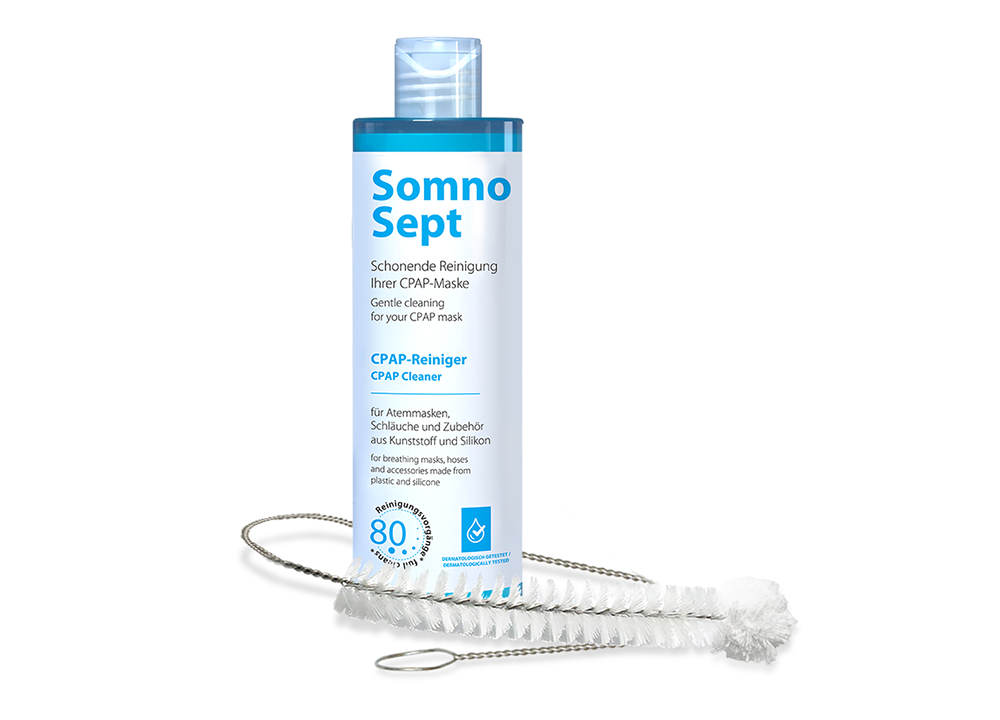 Eine gründliche Reinigung der CPAP-Ausrüstung ist entscheidend für die Therapie. Der dermatologisch getestete SomnoSept-Reiniger entfernt zuverlässig Schmutz und hinterlässt einen angenehm frischen Duft.